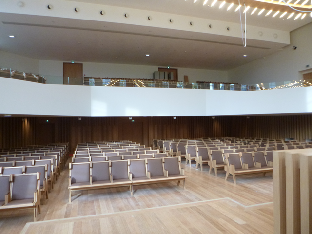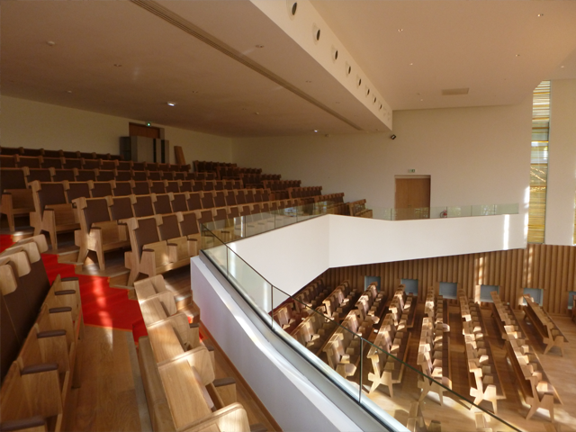 Notamment son isolement de façade visé et atteint est de 40 dB et l’intelligibilité et le confort d’écoute a été spécialement travaillé pour assurer une juste répartition entre absorption et diffusion du son.