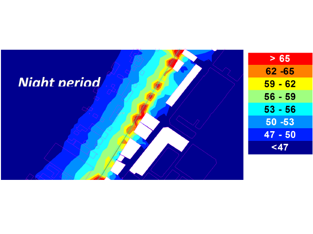 Sur cette base, il aura été identifié le spectre 1/3 d’octave de puissance acoustique émise par les viaducs. Cette puissance acoustique, combinée à la puissance acoustique du train proprement dit (bruit de roulage, de moteurs, et aérodynamique) a permis de tracer une cartographie d’impact acoustique prévisionnelle du projet.