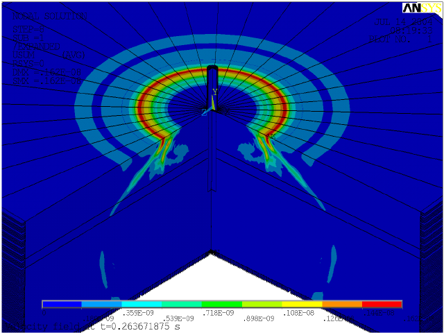 En premier lieu, à partir d’un modèle par élément fini de la structure en béton armé du viaduc et de la simulation de la sollicitation dynamique du roulage (contact roue-rail), il a été possible de calculer le champ des vitesses vibratoires sur la surface extérieure de l’ouvrage.